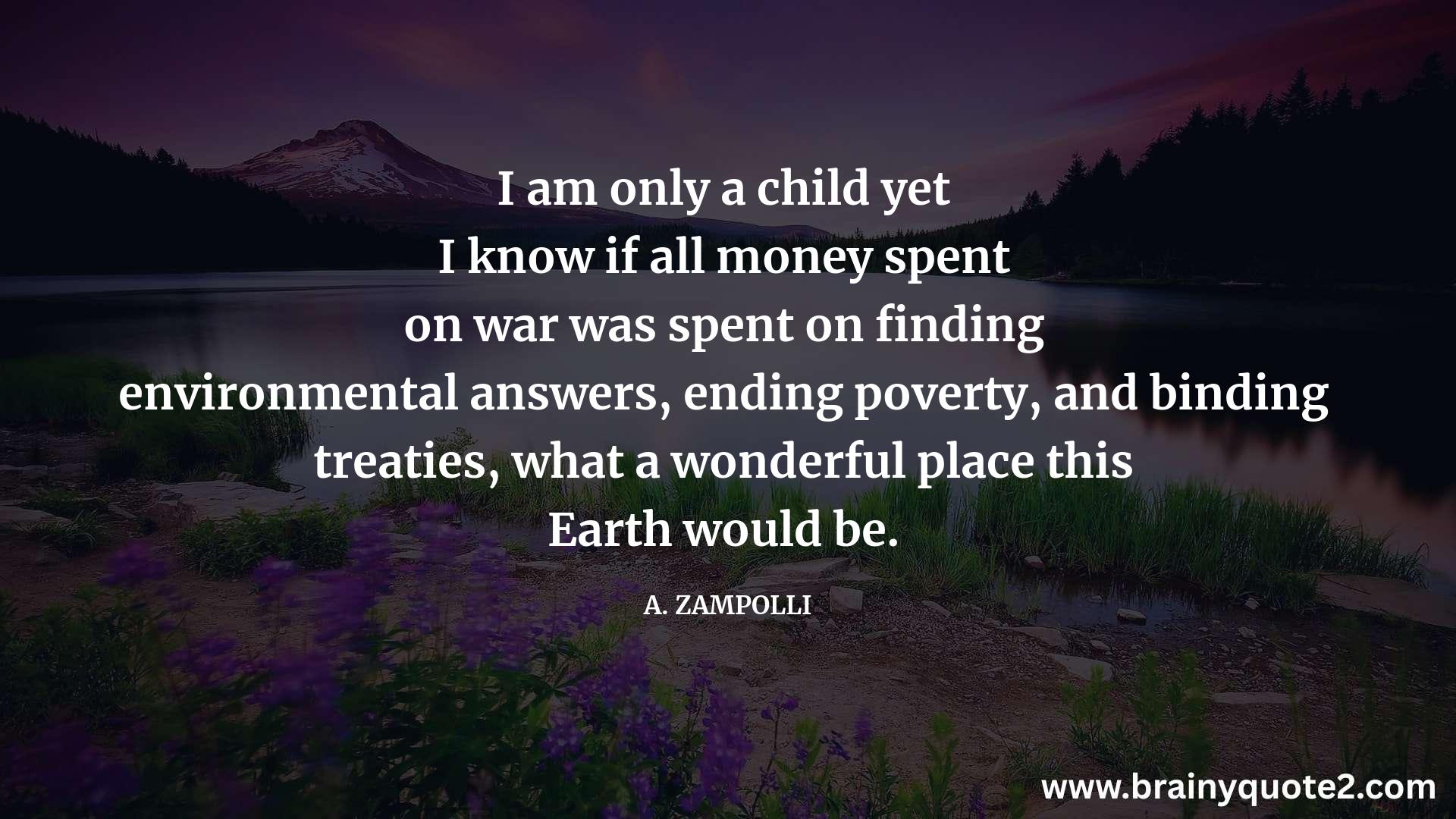 I am only a child yet I know if all money spent on war was spent on finding environmental answers, ending poverty, and binding treaties, what a wonderful place this Earth would be.