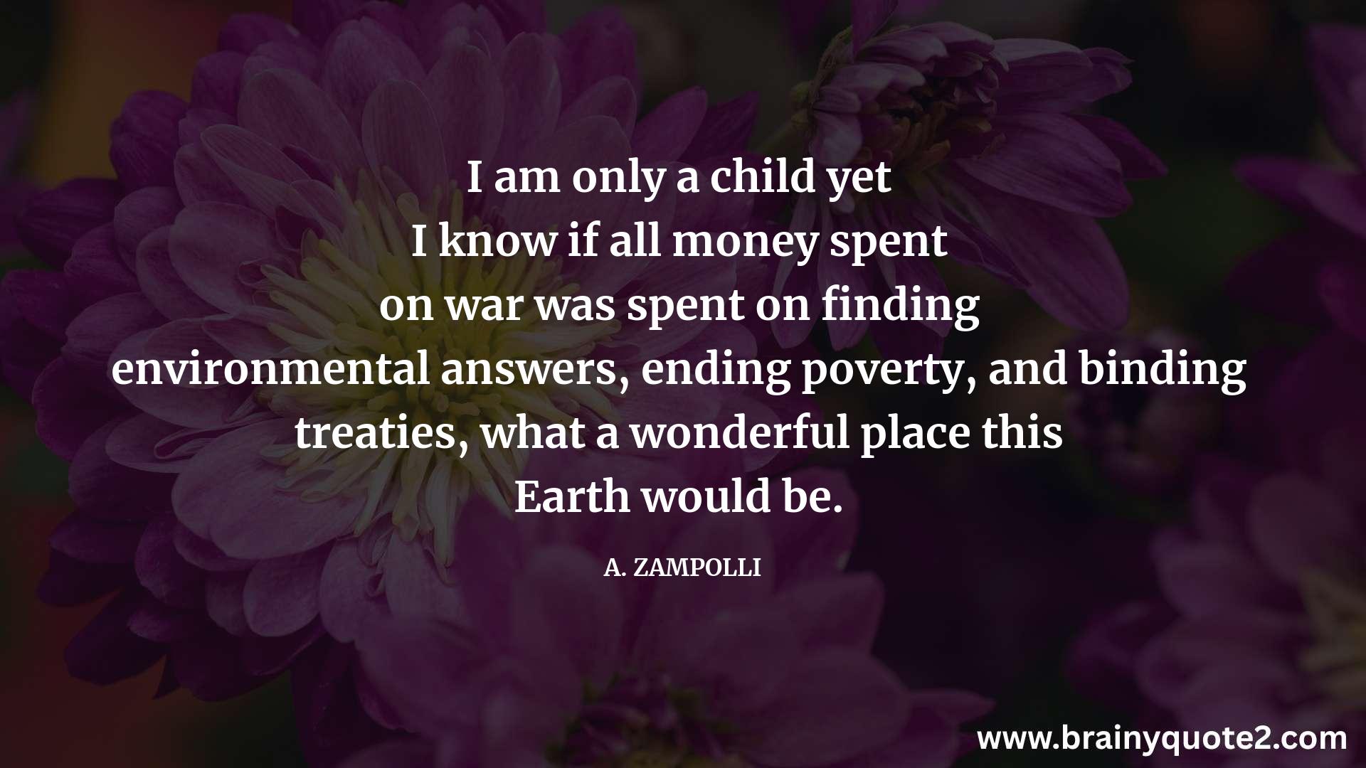 I am only a child yet I know if all money spent on war was spent on finding environmental answers, ending poverty, and binding treaties, what a wonderful place this Earth would be.
